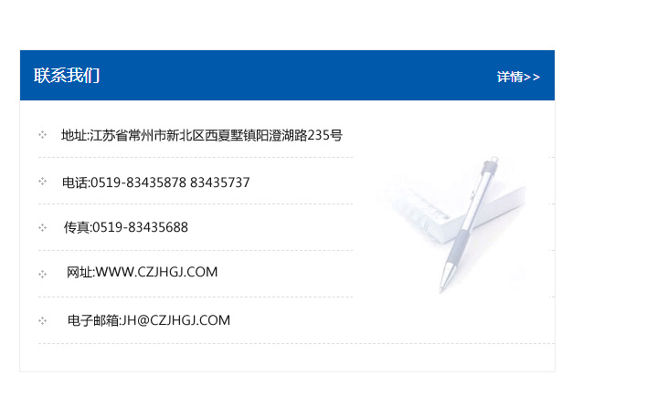 地址:常州市新北區友邦商務大廈1幢16、17層  電話:0519-85101652  傳真:0519-85112595  郵編:213022  網址:www.cz-jiayue_cn.libufan.com  郵箱:xiajifengaa@163.com